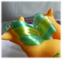 3: Hair rooting style.You can see from the image above that the Tutti Frutti pony from the UK has her hair falling on her non-display side. The packaged pony pictured above shows that this is how she was sold. The streak in her hair is therefore rooted above the green to fall on her non-display side. The European pony, on the other hand, is rooted so that her mane falls on her display side. As a result, her yellow-gold streak is rooted to fall over the top of this on her display side. This is a uniform feature I have noticed in all the UK vs European sold ponies I have seen, so appears to be the most definitive way of telling the two apart.