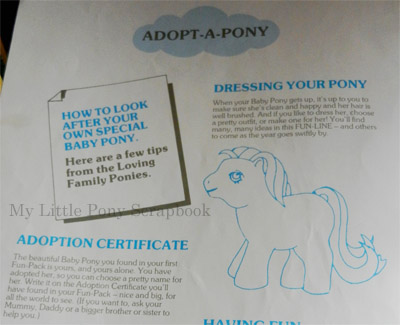 These images are scanned from a My Little Pony comic, advertising the My Little Pony Club, 1989 (complete with emotional blackmail!) The theme of 1989 was adoption of Baby Pony :)