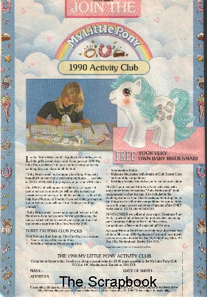 These scans come from a 1989 My Little Pony comic advertising the Club for 1990. This year's theme was Weddings, and Baby Bridesmaid was the pony being promoted and offered as a giveaway.