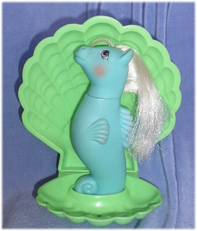 To my mind, Wave Jumper has always been the obscure one of the second set of Sea Ponies. I don't know why this is, but she seems to crop up on wantlists and ebay very infrequently in comparison to her fellows. She was sold in the "new" adult sea pony pose, which would only ever be used for three ponies in this set. There were no Adult Sea Ponies after this year.
