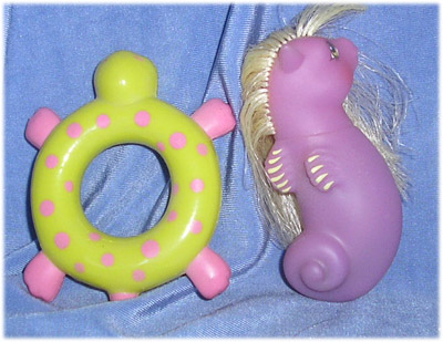 purplish baby sea pony with gold mane,yellow fin paint.Lime green and pink turtle float.