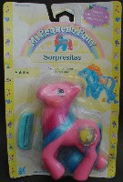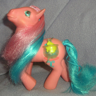 Wriggle Pocket was a rather odd kind of pony, being that she spent time walking around ponyland with a fishbowl complete with water and fish attached to her rear end. The fish had the nickname of "Wriggle", which was not very original to say the least! The fishbowl and fish are often missing on loose examples.